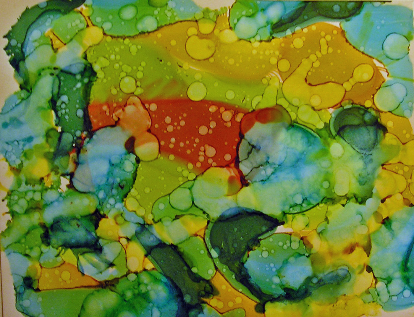 Cathy demonstrated several techniques....blowing the inks on the paper through a drinking straw was one. Also, making the inks move around on the yupo by dropping rubbing alcohol (91%) on them. She encouraged us to spend some time just experimenting with these techniques. Here are some of my efforts.